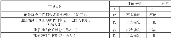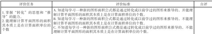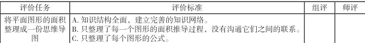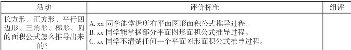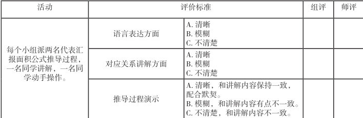 小组内部交流平面图形的面积公式推导过程,一位组员讲的时候,其他组员给出评价等级。评价标准见上述评价标准表。