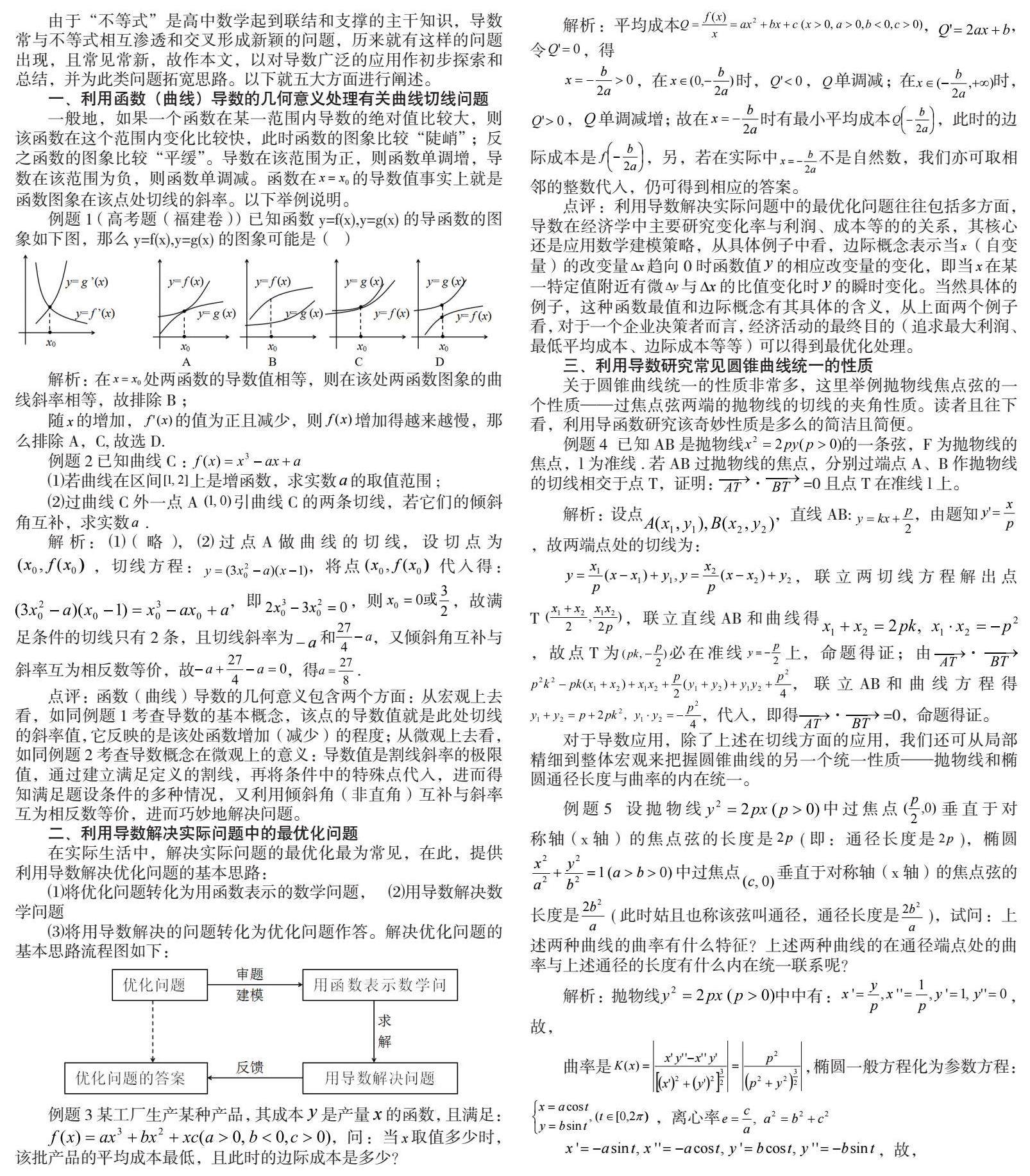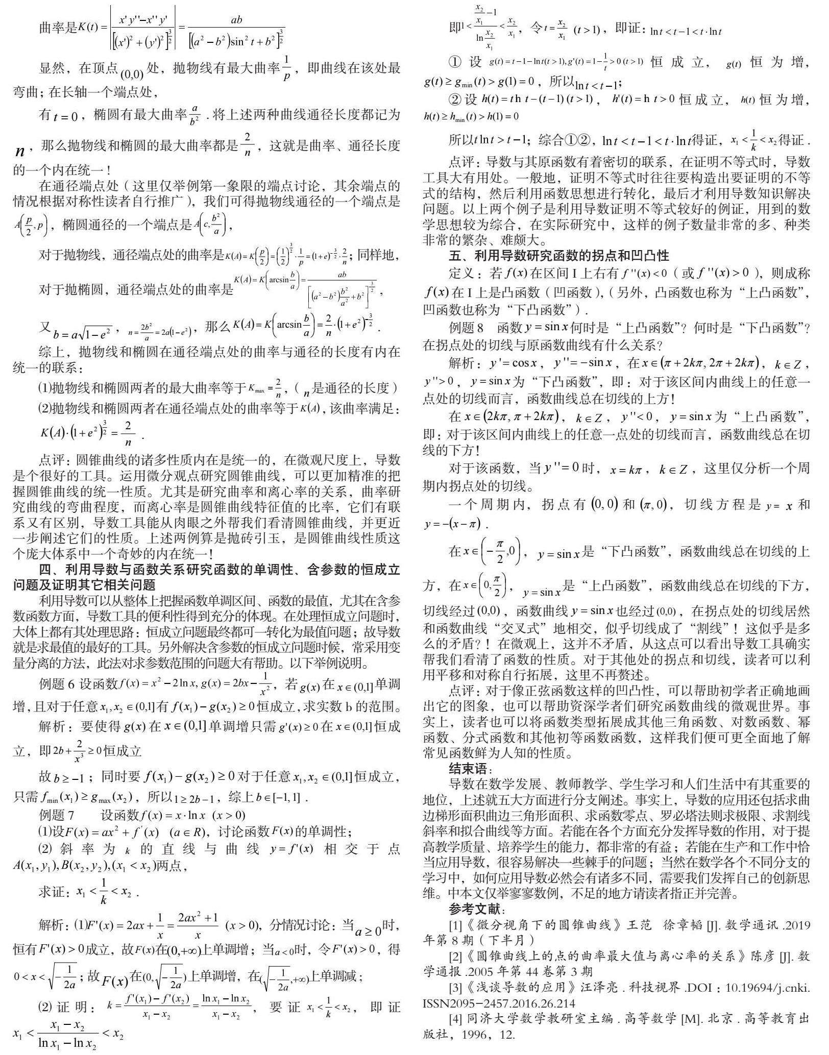 导数在数学发展、教师教学、学生学习和人们生活中有其重要的地位,上述就五大方面进行分支阐述。事实上,导数的应用还包括求曲边梯形面积曲边三角形面积、求函数零点、罗必塔法则求极限、求割线斜率和拟合曲线等方面。若能在各个方面充分发挥导数的作用,对于提高教学质量、培养学生的能力,都非常的有益;若能在生产和工作中恰当应用导数,很容易解决一些棘手的问题;当然在数学各个不同分支的学习中,如何应用导数必然会有诸多不同,需要我们发挥自己的创新思维。中本文仅举寥寥数例,不足的地方请读者指正并完善。