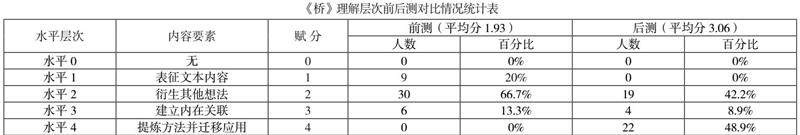 从表中不难发现,学生对《桥》的理解水平有了一定的提升(平均分从前测的1.93分提高到后测的3.06分)。在后测中还可以发现,达到水平4的学生有22人(占48.9%),说明通过概念构图“四图一思”教学路径,学生不仅理解了这篇课文,感受了老汉这个人物形象,还提炼出了阅读小说的基本方法,并能够用这个方法迁移应用,这些都很好地证明了教学的有效性。不过,后测中还有19人停留在水平2(占42.2%),未形成结构化理解或抽象性理解,说明对于六年级的学生来说,要形成关联结构、学习策略,还是有一定的难度,需要多加练习才可以巩固。