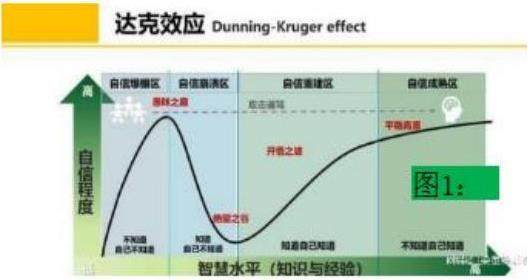心理学上的达克效应(也称邓宁-克鲁格效应):能力缺乏者,在自己欠考虑的情况下得出错误的结论。这些能力缺乏者沉浸在自己营造的优势虚幻中,高估自己的能力,无法客观评价他人。图1。