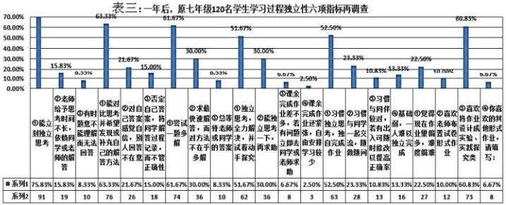 再对原120名学生也分学习过程独立性六项指标调查,详细结果见表(三)。