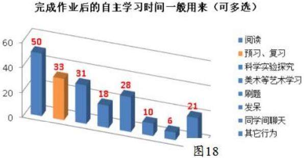 学生掌握项目探究实践自主学习的方法,做学习的主人。学会策略性地学习;学会自我评价,共同评价,师生评价,评价意识提高,自主合作探究意识得到增强。再对学生完成作业后自主学习时间安排调查,结果见图18。从调查及观察可看出,学生对于阅读、科学实验探究等增多,而发呆、聊天等明显减少。