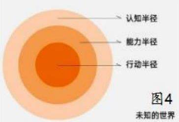美国气象学家J·马歇尔谢博德博士认为人的认知范围可看成一个圆圈(图4),认知半径变大,人的认知范围也就随之增大。视野拓宽了,愿意接纳的事物也就越多,知识盲区也会逐渐被打破。