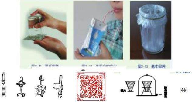 再思考:能不能更生活化、更有“学景”联系。预学过程,可让学生提前模拟“课堂实验”,产生悬念,并自主探究。学生思维一旦激发就活跃发散,有许多突发奇想。同时也可给网络资源辅助,让学生学会解密(图6扫描二维码观看实验材料和操作步骤)。