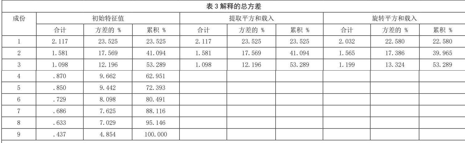 KMO值大于0.6,且Bartlett球形检验的P值为0.000,小于0.001。通过了KMO和巴特利特检验,所以我们可对本问卷进行因子分析。具体数值见表3