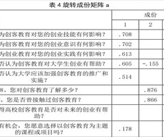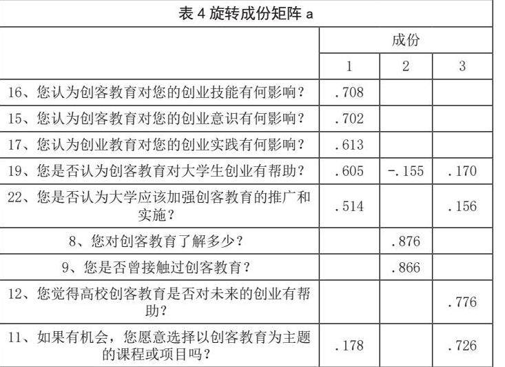 根据表中初始特征值的合计一列大于1的共有三项且这三项的旋转平方和载入百分比共占53.289。所以可将本问卷分为三个因子。根据表4可见,题15、16、17、19、22属于第一个因子,题8、9属于第二个因子,题11、12属于第三个因子。我们将第一个因子命名为创客教育对创业的影响,将第二个因子命名为了解创客教育的程度。将第三个因子命名为是否愿意接触创客教育。