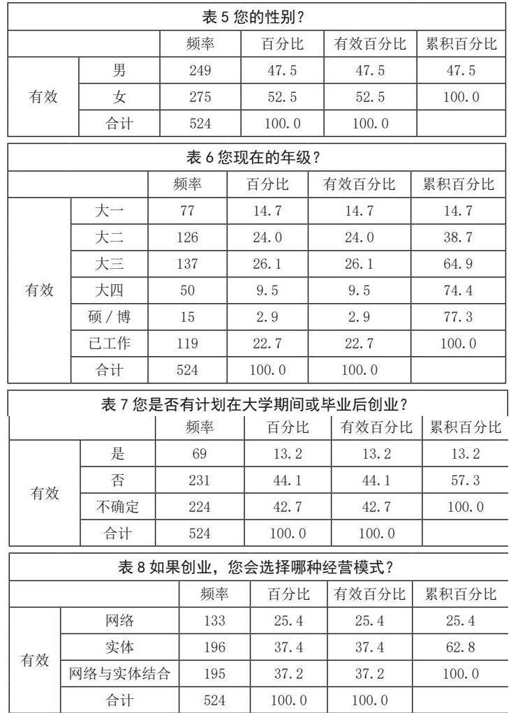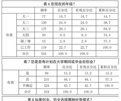 在下列表中可以看出,在性别方面,问卷调查对象中男女比例为47.5%和52.5%,各有249人和275人。问卷反馈对象性别比例大致相同。在年级方面大一为77人,大二126人,大三为137人,大四为50人,硕/博为15人,已工作为119人。其中大三与已经工作的人次最高。大三人群相比于大四人群更加积极运用所学的创客教育应用到实际创业当中,在当中边学边做,并没有大四人群面临工作方式选择的压力。而已工作人群,或多或少已经有了对创业的完整认知,所以对这两类人次调查频率较高。在调查反馈人群中,计划在大学期间或者毕业进行创业的人数只占13.2%,不创业的有44.1%将近占总数的一半,而感到不确定占42.7%,是否可以提出假设,高校创客教育还需进行更深一步的发展,增加对学生创业的影响。最后如果进行创业,选择纯网络创业的占25.4%,选择实体的占37.4%,而选择两者兼顾的占37.2%。在互联网技术与科技创新技术高速发展的当下,对于创业的技术要求也在提高,对于网络创业的比例也在提高。高校如何抓住时代潮流,选择创客培养方式也显现的尤为重要。