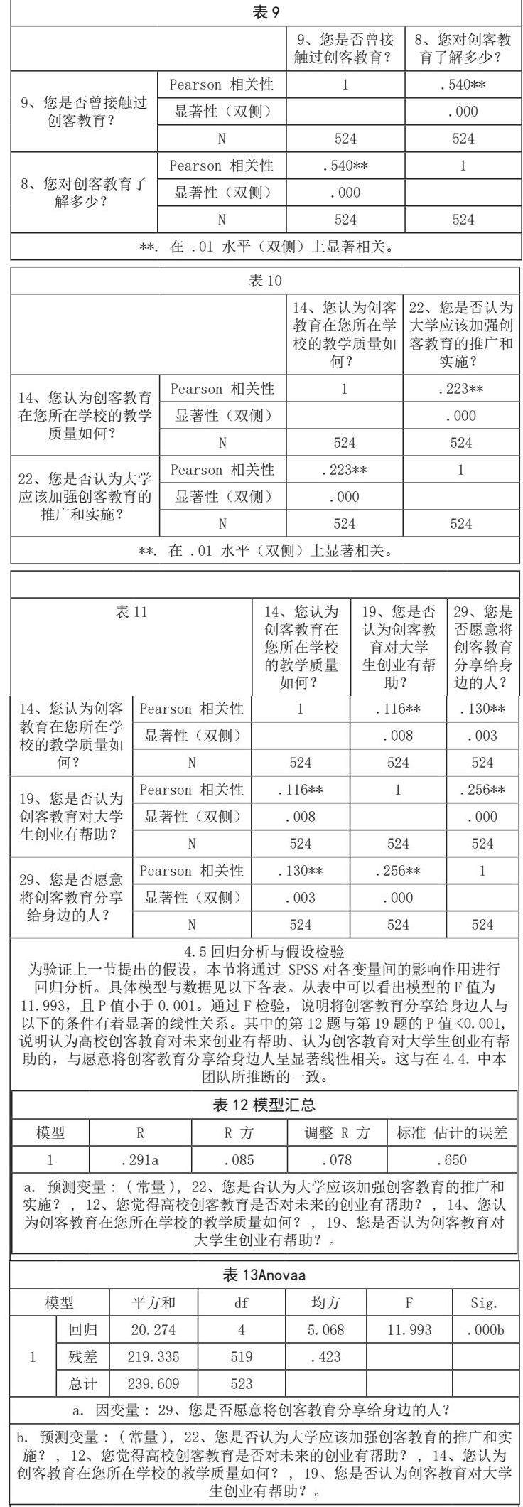 由表9可知第9题与第10题之间呈正相关,相关系数为0.54,且P值<0.01。说明,对创客教育接触的越多,那么对创客教育就越了解。由表10可知,题14与题22呈正相关,相关系数为0.223,P值<0.01。说明在一定程度上,创客们在高校就读期间,若是接受过良好的高校创客教育,那么认为应该加强创客教育的推广与实施的倾向也会加强。由表11可知。题14与题19、29并无太大关联,所以主要研究题19与29之间的相关性。两者之间的相关系数为0.256呈正相关,P值<0.01。那么便可以假设,在一定程度上,越是觉得高校创客教育对大学生创业有帮助的人,越是希望将高校创客教育分享给周围的其他人。