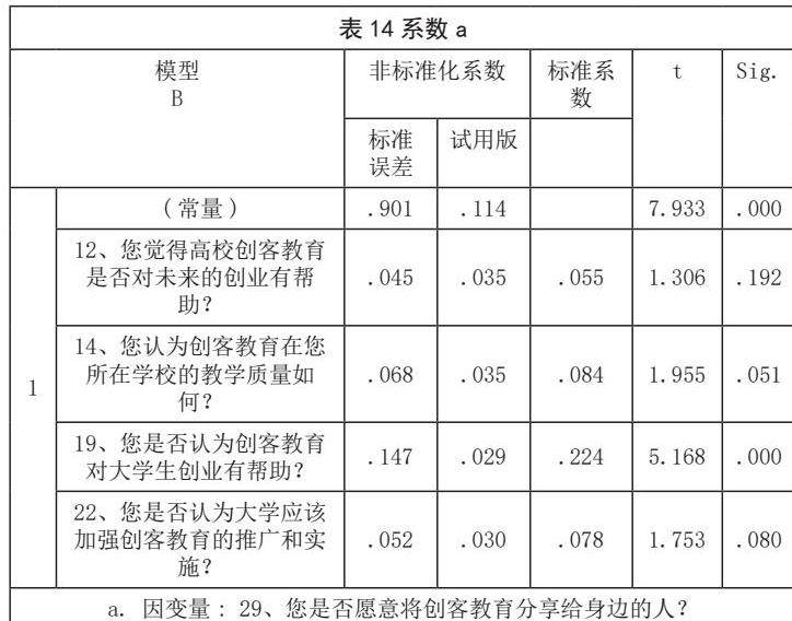 为验证上一节提出的假设,本节将通过 SPSS对各变量间的影响作用进行回归分析。具体模型与数据见以下各表。从表中可以看出模型的F值为11.993,且P值小于0.001。通过F检验,说明将创客教育分享给身边人与以下的条件有着显著的线性关系。其中的第12题与第19题的P值<0.001,说明认为高校创客教育对未来创业有帮助、认为创客教育对大学生创业有帮助的,与愿意将创客教育分享给身边人呈显著线性相关。这与在4.4.中本团队所推断的一致。