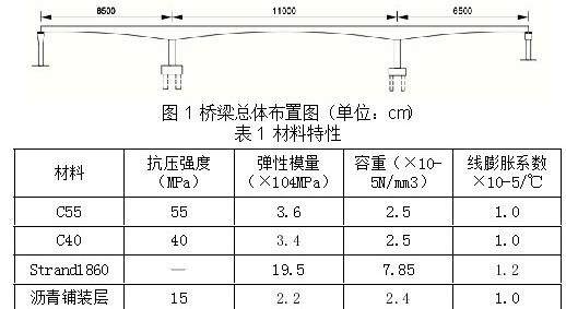 本研究大跨变截面连续刚构桥全长240m,桥跨布置为(65+110+65)m的连续刚构桥,主跨110m。结构材料方面,主梁、桥墩分布采用C55、C40混凝土,立面布置图如图1。采用MIDAS CIVIL 2022桥梁专用分析软件建立全桥模型,其中混凝土和钢绞线依据规范《铁路桥涵混凝土结构设计规范》(TB 10092-2017),混凝土周围环境相对湿度70%。钢绞线张拉控制应力,预应力筋采用标准强度为1860MPa的高强度低松弛钢绞线,其钢绞线的直径为Φ15.2,其余各材料特性见表1。基于《铁路桥涵混凝土结构设计规范》(TB 10092-2017),以考虑混凝土收缩徐变,加载龄期为3d,粉煤灰含量为0建立基准模型,其中收缩徐变预测模型选用JTG3362-2018预模型。分析工况考虑了支座沉降、恒载、预应力钢束及混凝土收缩徐变等长期荷载作用,具体工况如下:0.5支座沉降+恒荷载+钢束预应力+收缩徐变。