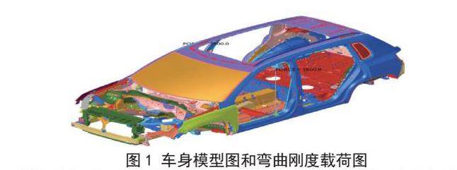 所设定的边界条件:约束左后减振器安装支中心点X,Y和Z三个方向自由度,右后减振器安装支座中心点X,Z两个方向自由度,左前减振器安装支座中心点Y,Z两个方向自由度,右前减振器装支座中心点Z方向自由度,如图1所示。白车身弯曲刚度分析加载点位于前后悬架阻尼减振器支座连线中心点且垂直于门槛梁的位置,加载力的大小为 F=1000N,沿Z轴负方向。