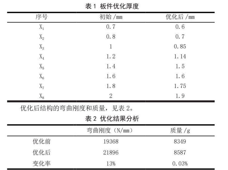 在精度可靠的基础上进一步确认优化效果,从表2可知在整车白车身质量在减少0.03%的情况下,车身弯曲刚度提高了13%。