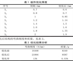 优化后结构的弯曲刚度和质量,见表2。