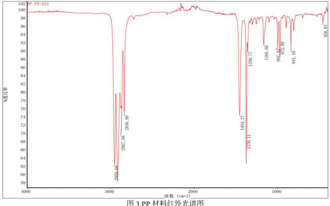PP 材料红外光谱图显示,PP 材料的特征吸收峰主要来源于脂肪烃类官能团的振动,主要为CH,