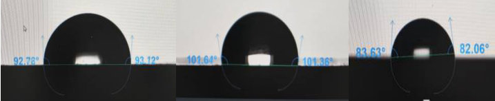 ,针头距离材料平面垂直距离2mm;触发滴液时,手动匀速按压滴落装置,滴液沉积后,高速相机会立即开始拍摄,每秒 10 帧,连续采集 8s 图像,拍摄结束后切入单元分析,自动计算接触角均值。接触角越大,材料的润湿性越低,被测样品疏水性能就越好。