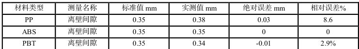 按照测量方法对 PP、ABS、PBT 三种材料组件同坐标位置[X:6.064,Y:5.328,Z:0.000] 进行间隙测量,每个位置测量2 次,取均值为实测值,测量结果如表5 所示,测量的平均值进行对比, 计算绝对误差和相对误差,分析得出变形程度PP 材料>PBT 材料