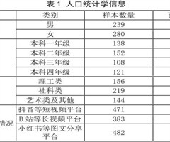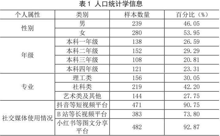 本研究以深圳地区高校大学生为调查对象,共收回519份有效问卷。据表1样本人口统计学特征显示,参与者性别、年级、专业分布均衡,为研究提供了具有代表性的基础数据。