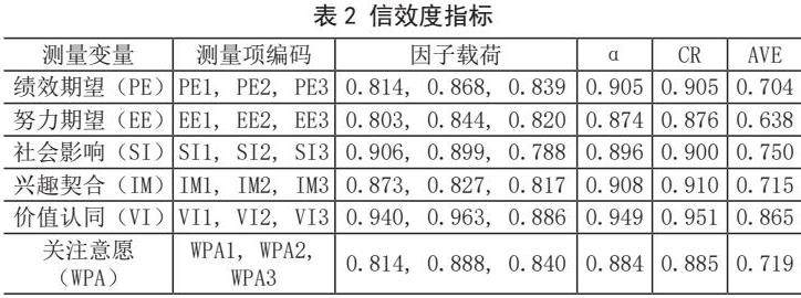 通过SPSS对数据的信度分析显示,各变量的克隆巴赫系数(α)和组合信度(CR)均超过0.8,表明模型具备较好的信度;各变量的因子载荷均大于0.7,平均提取方差值(AVE)超过0.6,表明模型收敛效度较好,同时说明在关注自媒体KOL的行为变量中,绩效期望、努力期望、社会影响和兴趣契合等主要变量分布呈现明显差异,表明大学生群体对KOL的关注受到多重因素的驱动。