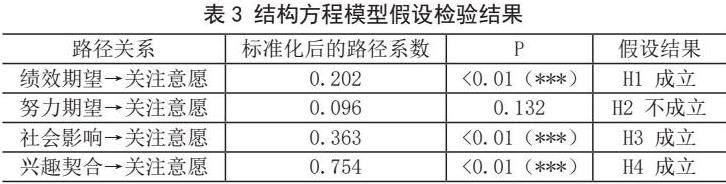 利用SPSS对模型假设进行分析,结果如表3所示,绩效期望、社会影响和兴趣契合对大学生关注自媒体KOL的意愿具有显著正向影响(p<0.01),其中兴趣契合的标准化路径系数最高(0.754),表现为主要驱动力。相较之下,努力期望对关注意愿的直接影响并不显著。