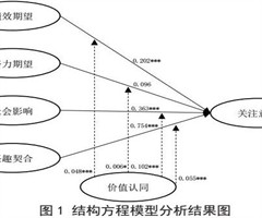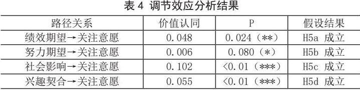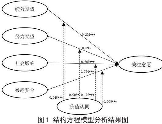 引入价值认同作为调节变量后,调节效应在1%置信水平上显著增强了社会影响和兴趣契合对关注意愿的影响力度,同时对绩效期望、努力期望这一变量的影响起到边缘性推动作用。结构方程模型分析结果如图1所示。
