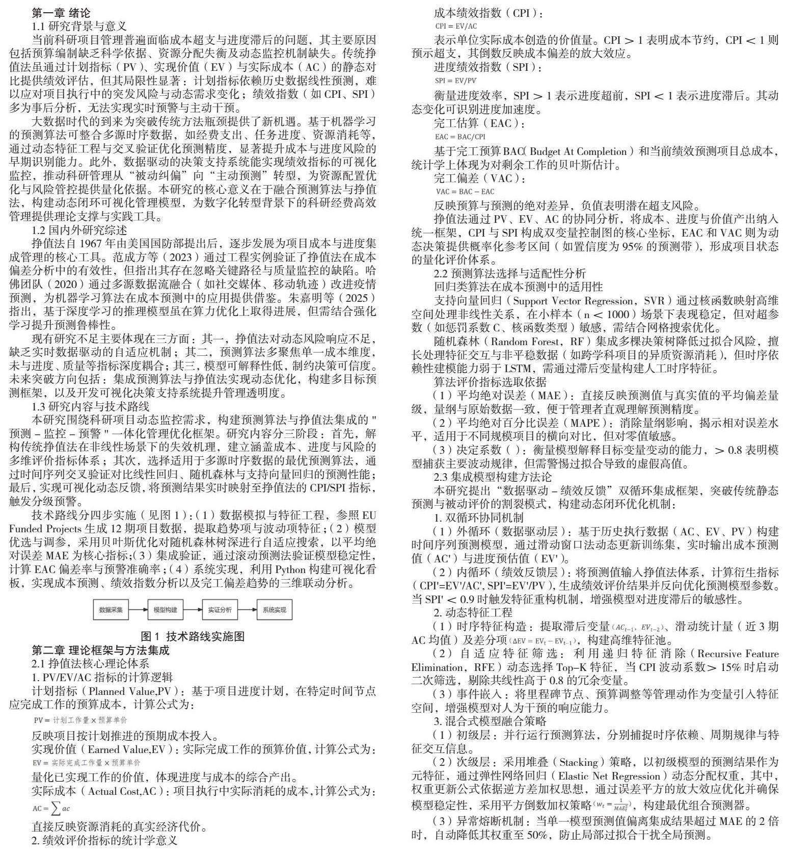 本研究围绕科研项目动态监控需求,构建预测算法与挣值法集成的"预测-监控-预警"一体化管理优化框架。研究内容分三阶段:首先,解构传统挣值法在非线性场景下的失效机理,建立涵盖成本、进度与风险的多维评价指标体系;其次,选择适用于多源时序数据的最优预测算法,通过时间序列交叉验证对比线性回归、随机森林与支持向量回归的预测性能;最后,实现可视化动态反馈,将预测结果实时映射至挣值法的CPI/SPI指标,触发分级预警。