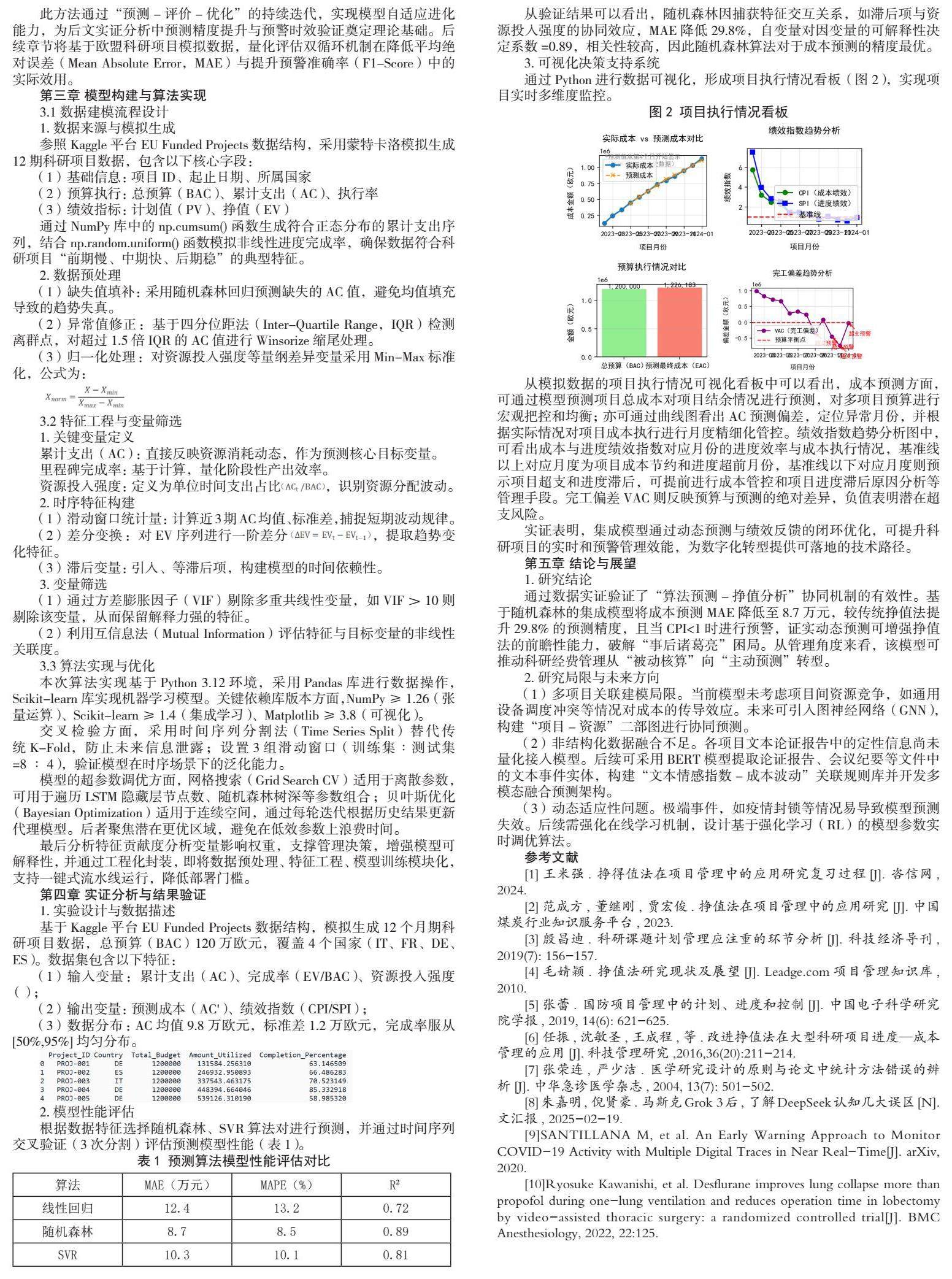 技术路线分四步实施(见图1):(1)数据模拟与特征工程,参照EU Funded Projects生成12期项目数据,提取趋势项与波动项特征;(2)模型优选与调参,采用贝叶斯优化对随机森林树深进行自适应搜索,以平均绝对误差MAE为核心指标;(3)集成验证,通过滚动预测法验证模型稳定性,计算EAC偏差率与预警准确率;(4)系统实现,利用Python构建可视化看板,实现成本预测、绩效指数分析以及完工偏差趋势的三维联动分析。