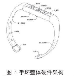 整体硬件架构概述:老年智能手环以手环主体为核心,基于 MMPose 实现多模块协同运作(见图 1)。主体两端采用可调节连接,通过卡槽与卡销适配不同腕围,确保佩戴稳固舒适。顶部安置槽用于安装核心功能组件设备框,借助定位组件,保障设备在运动时稳定,防止干扰数据采集与处理。
