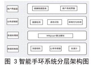 基于MMPose的老人智能手环软件采用分层架构(如图 3),依次经数据采集层、数据处理层、业务逻辑层和用户界面层,实现完整的健康监测与交互功能。
