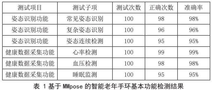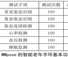 1)AI技术应用效果评估:我们对于基于MMPose+技术的智能手环在健康监测、姿态识别及安全防护方面进行测试,发现其在各方面都有较高的准确性和实时性(如表 1),显著提升了养老公寓的服务质量。