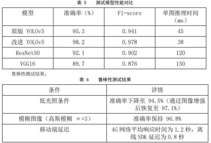 在系统的鲁棒性方面,也进行了全面的测试。在模拟的低光照条件下,准确率虽下降至94.5%,但通过有效的图像增强技术,准确率恢复至97.1%,证明了图像增强技术在提升系统应对低光照环境时的有效性。在模糊图像(高斯模糊σ=3)条件下,准确率保持在96.8%,这表明系统对模糊图像具有较好的适应性,能够在一定程度上克服图像质量下降对识别结果的影响,保证了系统在复杂环境下的稳定运行。
