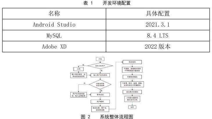 系统开发环境如表 1 所示,系统开发使用了Android Studio,数据库采用MySQL数据库,UI设计采用Adobe XD,其整体工作流程如图 2 所示。