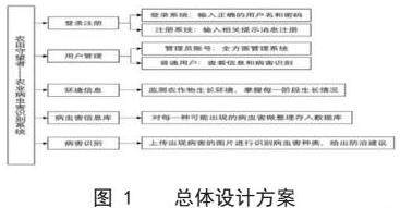 农业病虫害识别系统采用多模块集成与智能化驱动设计,架构清晰。核心有五大模块:登录注册系统管理用户准入与权限;用户管理模块整合维护用户信息;监测环境信息板块实时采集分析农作物生长环境参数;病虫害信息库存储、检索病虫害数据并传播知识;农业病虫害识别模块借深度学习精准诊断。