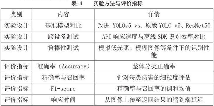 摘 要:农业病虫害始终是制约农业生产效率和品质的重要因素,传统人工检测方法主观性强、精度不足且难以满足现代农业的需求。本文针对这一现实难题,提出一种融合YOLOv5模型与EasyDL平台优化的智能农业病虫害检测系统。研究采用了公开数据集与自建中草药病害图像库,通过创新的数据标注策略和模型参数精细调优,使YOLOv5模型的识别准确率从原来的95.3%提升至98.2%,同时系统集成实时环境监测功能,有效提升了病虫害预警能力。实验结果表明,该系统在不同光照与图像质量条件下仍表现出较好的鲁棒性,移动端平均响应时间小于1.2秒,满足了实时检测需求。经福建省泉州市试点农田为期3个月的实地应用表明,系统的农药使用量减少32%,防治成本降低25%,土壤农药残留下降41%,体现出显著的经济与环境效益。本文研究为实现农业病虫害的精准识别与绿色防控提供了理论依据与技术支撑,对推动智慧农业与可持续发展具有重要的现实意义。