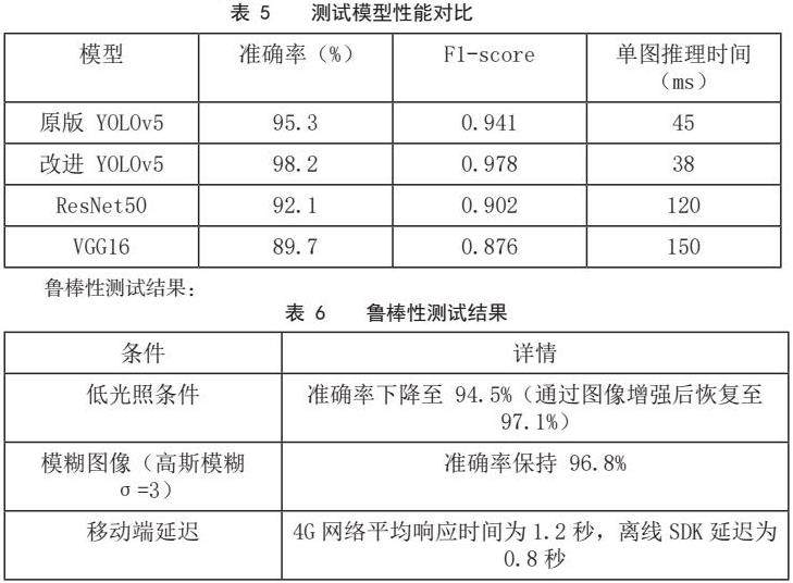 在系统的鲁棒性方面,也进行了全面的测试。在模拟的低光照条件下,准确率虽下降至94.5%,但通过有效的图像增强技术,准确率恢复至97.1%,证明了图像增强技术在提升系统应对低光照环境时的有效性。在模糊图像(高斯模糊σ=3)条件下,准确率保持在96.8%,这表明系统对模糊图像具有较好的适应性,能够在一定程度上克服图像质量下降对识别结果的影响,保证了系统在复杂环境下的稳定运行。