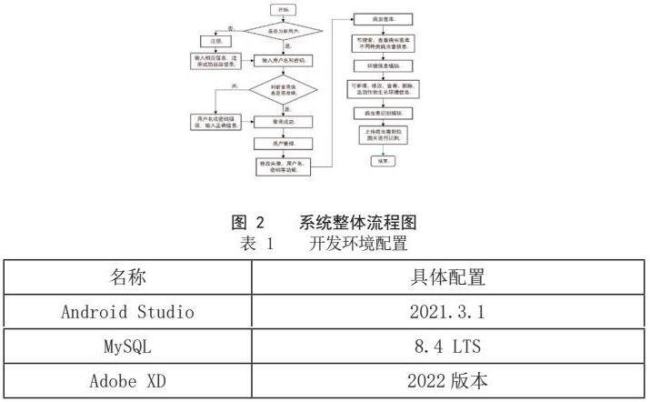 系统开发环境如表 1 所示,系统开发使用了Android Studio,数据库采用MySQL数据库,UI设计采用Adobe XD,其整体工作流程如图 2 所示。