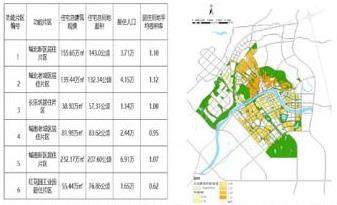 将溆浦县城总规中划定的六大居住片区分别计算其平均容积率,取人均住宅面积为40㎡/人,在控规中,分别统计出六大居住区的住宅总用地面积。在总规划定的各分区居住人口保持不变的前提下,各分区的总住宅面积始终保持不变。如果某一分区的总住宅用地面积增大,则其平均容积率会相应降低;反之,若总住宅用地面积减小,平均容积率则会增加。其中平均容积率最高为城北老城区居住片区,约1.12。最低为红花园工业园居住片区,约0.62。如下图所示。