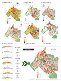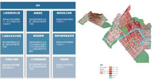以理想模型为基底,通过叠加分析,将基准地价、现状拆迁成本、交通承载力、基础设施、空置率和城市设计六个因子进行修正,如下图所示。