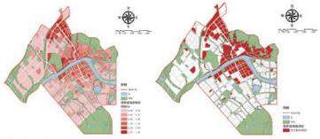 基于总规传导的住宅容积率,在老城区进行城市更新前,空置率的修正使实际容积率略高于规划人口计容积率。城南城北新区居住区域整体容积率增量略高,在0.3左右;城北旧城区长乐坊住宅小区0.28;城南旧城住宅区域则稍低,在0.24左右;最低的是红花园工业园住宅区域,在0.19左右。如下图所示。