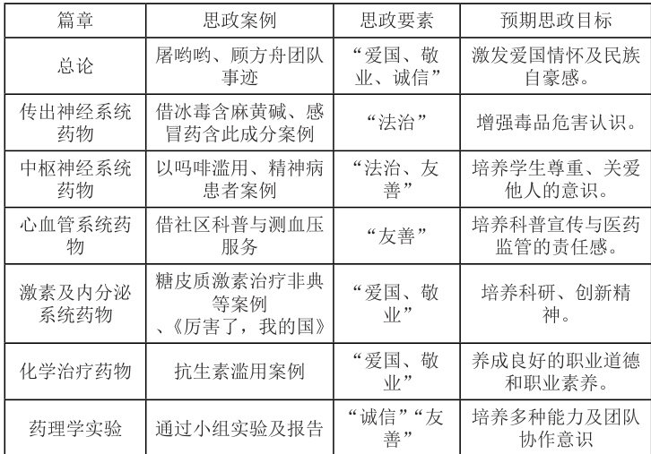近年来,全国各医药院校认真贯彻落实习近平总书记重要指示精神 [1],聚焦育人目标,着力构建药理学教育与思政教育深度融合的新型育人体系。积极探索 “课程思政融入药理学”的创新路径,推动药理学教育与思政教育协同发展、同频共振。目前,在药理学课程建设方面已取得显著成效。2020 年,教育部印发的《高等学校课程思政建设指导纲要》明确提出,需将思想政治教育全方位融入一流本科教育的整个进程之中 [2]。《药理学》作为贯通理论医学与实践医学、衔接医学与生物学的关键纽带,在中药学教育体系里占据着至关重要的地位。该课程覆盖面广,在学生群体中有着较大影响力 [3]。不过,当前这门课程在思政教育还存在着一些急需解决的问题。例如,思政要素较为零散,教师在进行思政教育时多依据个人的理解开展,尚未形成一套系统化、理论化的思政内涵推广模式;教师在教学过程中,讲授的结论性知识常常借助已有的常见案例,极少结合当下社会医药领域的热点事件以及学生的实际情况,导致对学生的影响力较弱。本文聚焦于探索全新教学方式,推动教学方向从传统的 “以教为主导” 向 “以学为中心” 转变 [4],促使教学模式由被动的 “教” 向主动的 “学” 变革,在药理学课程中融入思政教学元素 [5] 是极为必要的。通过这种方式,能够充分激发学生的学习热情,使其积极主动地参与到学习中。在教学实践中,把职业素养教育、爱国情怀培育以及社会主义核心价值观的传递,以巧妙的方式融入到药理学的各个教学步骤中,将专业知识的传授与思政教育的推进紧密交织、深度融合,全力培养一批既精通药理学专业知识,又具备高尚道德品质和正确价值观念的优秀医药专业人才,为社会输送综合素质高、全面发展的医药领域生力军。