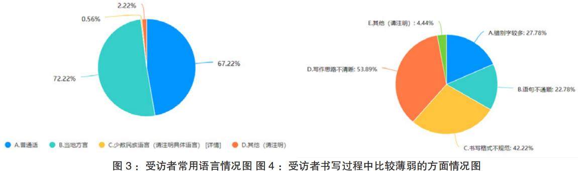 (1)在普通话水平方面,调查结果显示,约67.22%的受访者日常使用普通话进行交流,72.22%的受访者主要使用当地方言,在使用普通话交流时,遇到的主要困难有72.78%的受访者选择了“发音不标准”,34.44%的受访者选择了“词汇量有限,表达不清晰”。在文字读写能力上,大部分受访者具备基本的读写能力,但书写规范程度和写作水平参差不齐,在“在书写过程中,您觉得自己哪些方面比较薄弱”问题选择上,有53.89%的受访者认为是“写作思路不清晰”,有42.22%的受访者认为是“书写格式不规范”,还有部分受访者在书写中存在错别字较多、语法错误等问题,写作能力局限于简单的日常记录,难以完成较为复杂的文字表达任务,如撰写工作报告、宣传文案等。