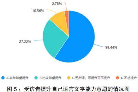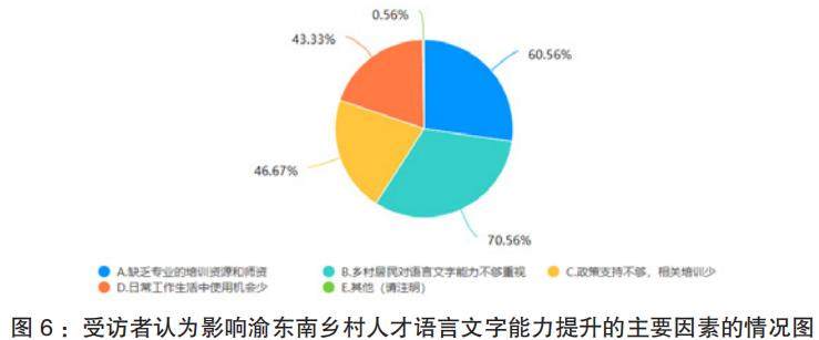 (4)政策支持不足。调查数据显示,在“您认为目前影响渝东南乡村人才语言文字能力提升的主要因素是?”问题,选择“政策支持不够,相关培训少”选项的46.67%的受访者。目前,针对渝东南乡村地区语言文字能力提升的政策相对较少,且缺乏具体的实施细则和有效的监督机制。政府在教育投入、人才培养等方面对乡村地区的支持力度不够,未能充分调动社会各方力量参与乡村语言文字教育和人才培养工作,导致相关工作进展缓慢。
