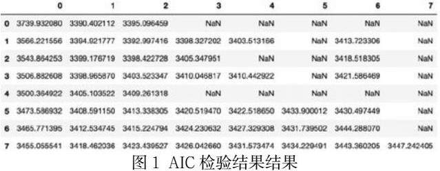 所使用的数据为平稳数据序列后,开始进行定阶p和q值。确定p和q的值可以通过AIC(赤池信息准则)来进行选择。取其数值最小的索引值来确定p和q值。