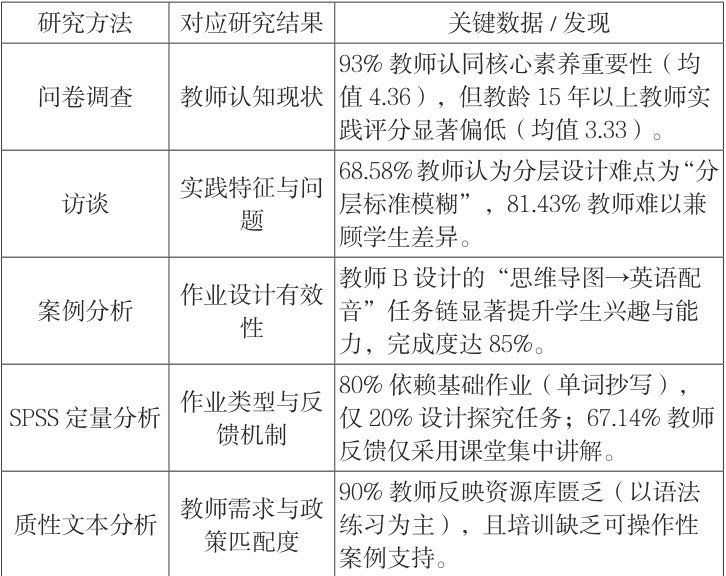 本研究调查了哈尔滨市 3 所初中的 70 名英语教师,涵盖各教龄段,通过问卷星平台收集数据,并访谈 10 名教师,结合八年级“节日文化”单元案例对比分析三名教师作业的不同得出了作业的有效性。其中问卷共 16 题,涵盖认知、实践、问题与反馈(Cronbachα=0.896 , KMO=0.727 ),信效度较好,研究数据适合提取信息。从数据分析得出教师对核心素养的认知与实践存在显著脱节,尤其教龄较长群体受传统模式束缚。教师也出现设计瓶颈,分层作业与反馈机制问题,削弱作业育人价值。