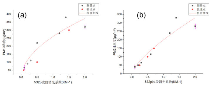 与 PM10、PM2.5 浓度亦呈线性相关。其中与 PM10 的对应拟合公式为C(PM10)=259.86095α(532p)0.51969 , 式中ɑ( 532p )为 532p 波段对应消光系数,C(PM10)为空气污染物(PM10)浓度,拟合度 R2=0.8583 ,P 值分别为 4.75231E-5 和 0.00516, 均小于 0.05 。验证点 ∝(532p)=0.08 、0.5、 1.5km-1 对应的浓度偏差分别为 39.87% 、81.26% 、 6.94% 。