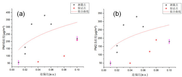 (图 a 为退偏比与 PM10 浓度对应拟合曲线 ; 图 b 为退偏比与PM2.5 浓度对应拟合曲线)