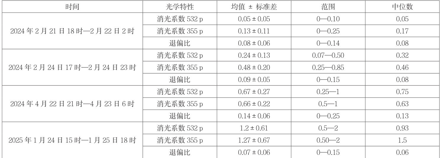 表1 不同时期气溶胶退偏比及355/532 p 消光系数平均值 ± 标准差、范围和中位数