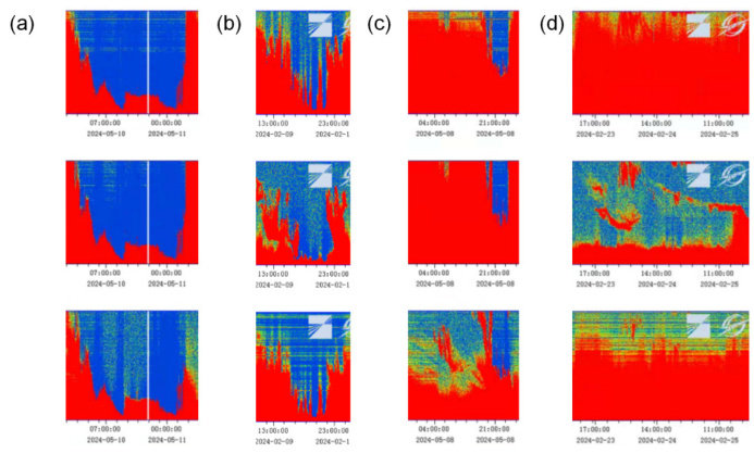 (图 a 为降雨对应信噪比结果伪彩图 ; 图 b 为降雪对应信噪比结果伪彩图;图 c 为云对应信噪比结果伪彩图 ; 图 d 为冰云对应信噪比结果伪彩图)
