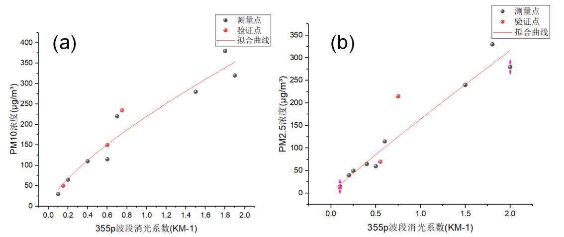 (图 a 为 355p 波段消光系数与 PM10 浓度对应拟合曲线 ; 图 b为355 p 波段消光系数与PM2.5 浓度对应拟合曲线)