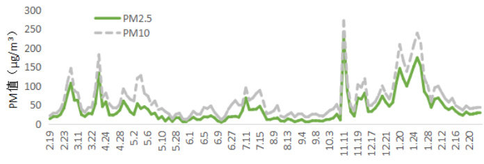 图 1 哈尔滨市区 2024 年 2 月 19 日至 2025 年 2 月 23 日 PM 值统计图