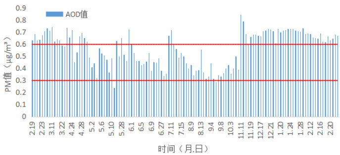 图 2 哈尔滨市区 2024 年 2 月 19 日至 2025 年 2 月 23 日 AOD 值统计图